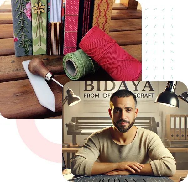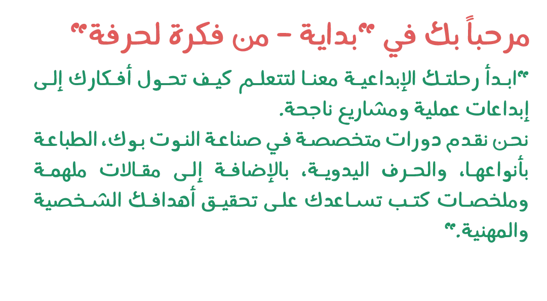 "نقدم مجموعة متنوعة من الدورات المتخصصة، مثل دورات تعليم صناعة النوت بوك، تقنيات التجليد اليدوي، الطباعة السوبلميشن، والطباعة على الهويات (ID)، بالإضافة إلى دورات عن تحويل الأفكار إلى مشاريع حقيقية."